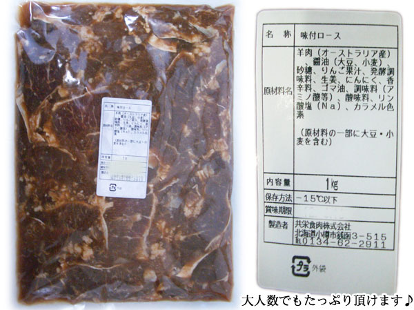 原材料名: 羊肉(オーストラリア産)、醤油(大豆、小麦)、砂糖、りんご果汁、発酵調味料、生姜、にんにく、香辛料、ごま油、調味料(アミノ酸等)、酸味料、リン酸塩(Na)、カラメル色素、(原材料の一部に大豆、小麦を含む)